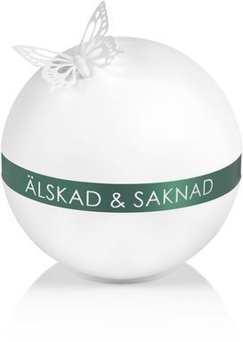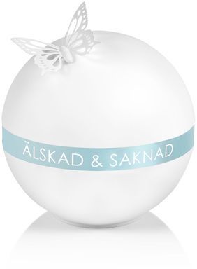 En personlig rund urna som är 100 % biologiskt nedbrytbar. Till urnan följer en nätt och vacker avtagbar fjärilssymbol på magnet som kan tas med hem (det finns möjlighet att beställa fler fjärilar separat under Tillbehör urnor). På det eleganta sidenbandet som finns att välja i flera färger, skrivs en sista hälsning med silverfolierad text. Väljer du Standardvarianten blir texten ÄLSKAD & SAKNAD enligt bilden. Vill du skriva något annat väljer du "Lägg till personligt tryck". Sänkningsband i siden medföljer. För varje såld TELLUS®urna doneras 5 kr till WaterAid.